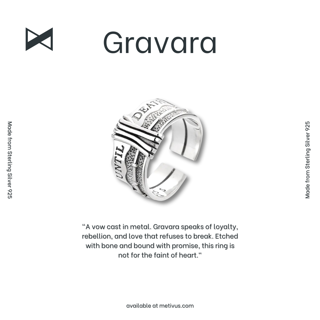 A vow cast in metal. Gravara speaks of loyalty, rebellion, and love that refuses to break. Etched with bone and bound with promise, this ring is not for the faint of heart.